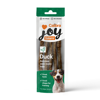 Calibra Joy Duck Salami Treats are premium semi-moist sticks made with 70% real duck and contain no chicken or wheat. Complementary food for dogs.